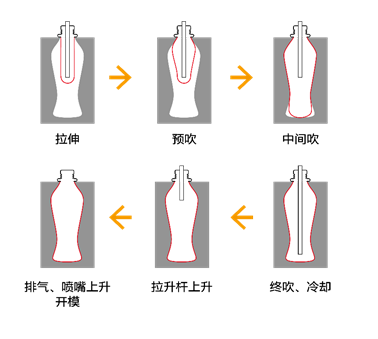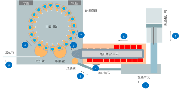 如下圖所示,整個旋轉吹瓶系統的結構,瓶胚由瓶胚注塑機注射成型,然后進入瓶胚提升機,通過理胚單元,像士兵隊列一樣排列整齊,進入瓶胚加熱單元,在這里,它會被多段溫區加熱變軟(瓶口必須確保能夠被夾裝到送瓶輪),以利于后道進入模具后的吹制。瓶胚由送瓶星輪機構次序送入對應的模具中,并合模,開始吹瓶過程,等吹瓶完成,將由取胚輪取走送出機器,進入后續的過程,需要清洗、消毒后進入灌裝單元。