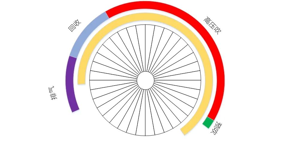 對于一個吹瓶的過程,可以看到在整個圓盤吹瓶系統中,每個吹瓶工站都將沿著整個圓周次序展開工作,如圖2所述,當送瓶星輪將前道預加熱的瓶胚送入吹瓶模具中,并合模,進入吹制階段。在初始階段完成預吹動作,并進入高壓吹瓶過程,再回收氣體,并排氣,然后瓶子即吹制完成,由吹瓶星輪送出。