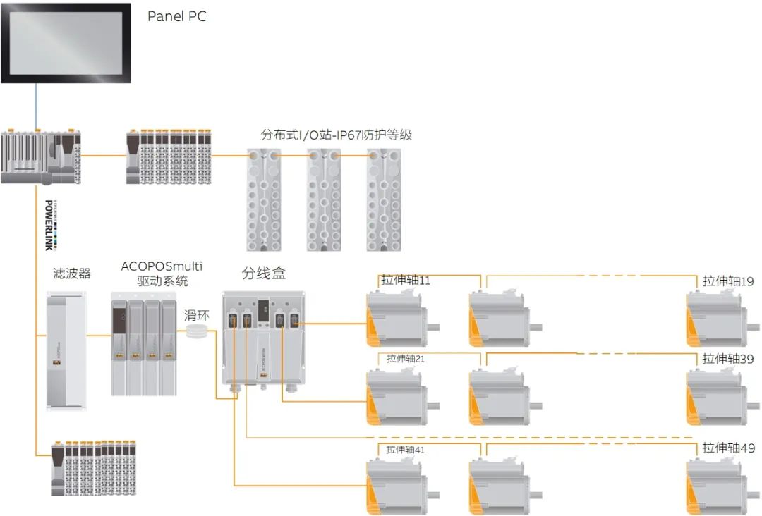 由于吹瓶站工位處于旋轉體內部,由于機械結構限制,使得其必須體積更為緊湊,并多達數十個吹瓶站,因此,貝加萊的ACOPOSmotor伺服電機與驅動一體的產品最為合適,它可以通過ACOPOSmulti的供電模塊提供動力輸出,并通過滑環連接進入圓盤吹瓶機械機構內部。通過ACOPOSremote的分線盒進行動力分配,然后控制伺服拉伸動作。