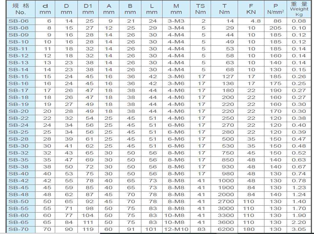 仕勛SB-18 SB-20 SB-22免鍵式軸套 軸環(huán)使用上的注意事1 所需傳動扭力的確認(rèn)2 軸與孔的加工精度要求3 同心度的要求4 是否有防銹的需求以上為一般注意事項,若有特別需求,請與我們聯(lián)絡(luò)